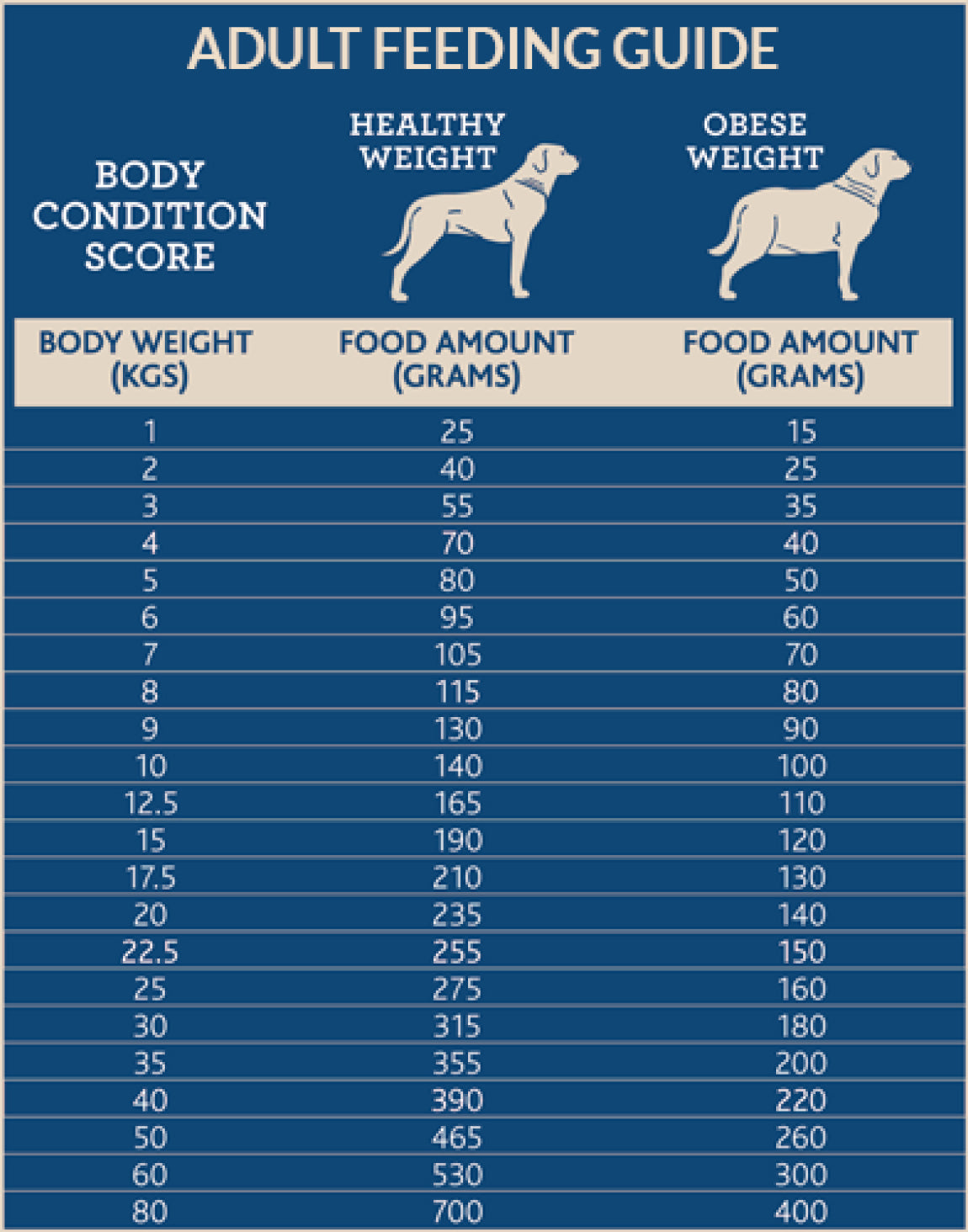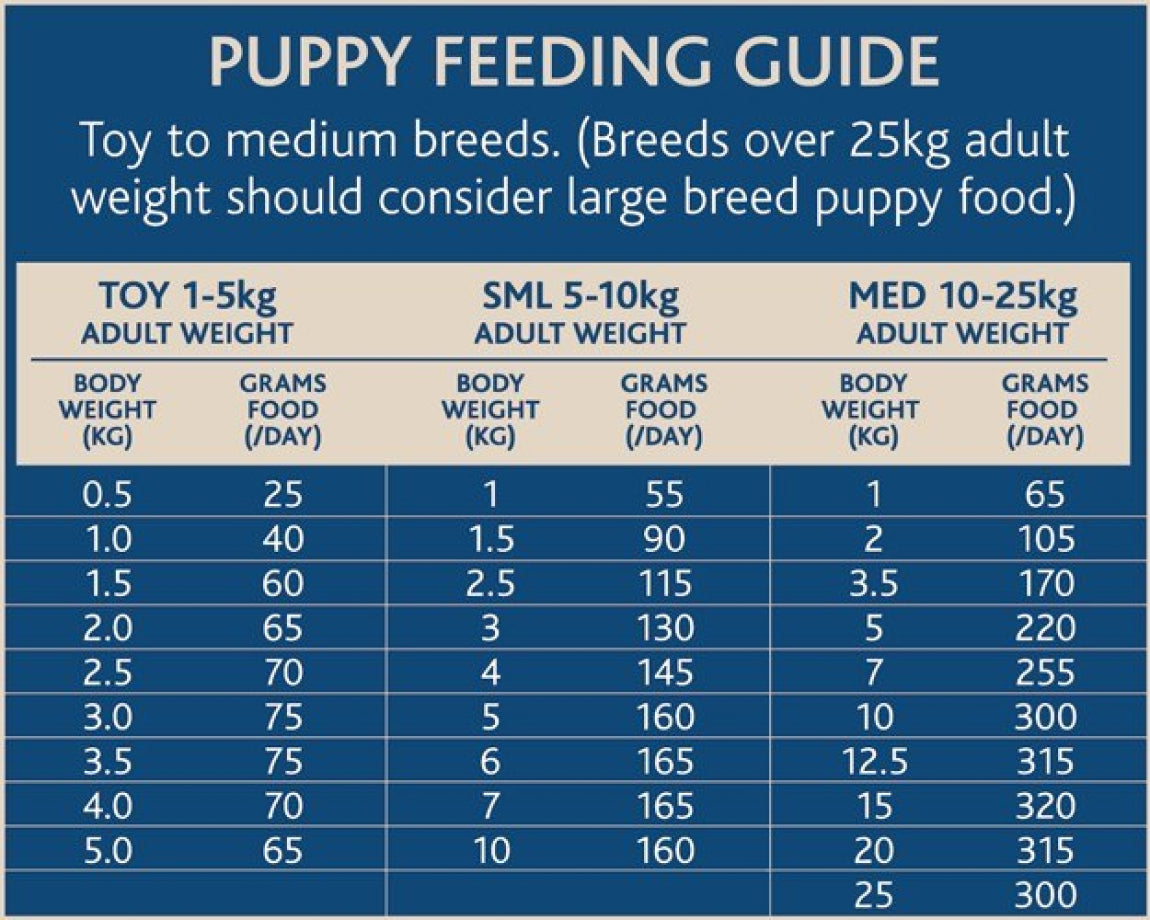 Using the chart above, divide the total feed per day by the number of times you feed your dog. Adult dogs should be fed once a day unless they have an underlying medical condition. Every dog is different so optimal feeding amounts can vary with age, weight and activity. Please use the above chart as a GUIDE ONLY and adjust for your individual dog’s needs. With all dogs, it’s best to keep them on the lean side of ideal condition rather than the overweight side of ideal.
